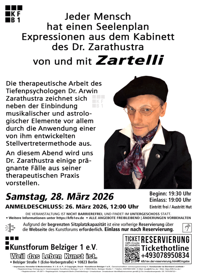 Sonntag, 15. März 2026Vernissage (Einlass ab 16:00 bis 19:00 Uhr)Einlass nur nach Reservierung.Eintritt: freiGALERIE B1Veranstaltungsdetails:AnmeldeschlussReservierung: erforderlich bis spätestens 13. März 2026, 12:00 UhrOrt: GALERIE B1 im Kunstforum Belziger 1 e.V., Belziger Straße 1 (Ecke Vorbergstraße),10823 Berlin-SchönebergANGEBOT FREIBLEIBEND! | ÄNDERUNGEN VORBEHALTEN!