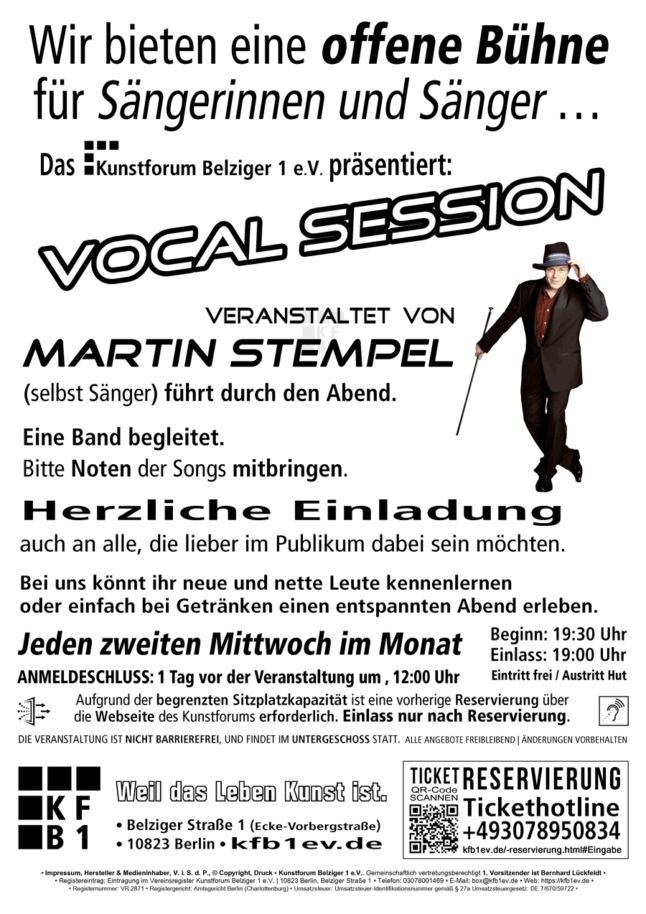 Sonntag, 15. März 2026Vernissage (Einlass ab 16:00 bis 19:00 Uhr)Einlass nur nach Reservierung.Eintritt: freiGALERIE B1Veranstaltungsdetails:AnmeldeschlussReservierung: erforderlich bis spätestens 13. März 2026, 12:00 UhrOrt: GALERIE B1 im Kunstforum Belziger 1 e.V., Belziger Straße 1 (Ecke Vorbergstraße),10823 Berlin-SchönebergANGEBOT FREIBLEIBEND! | ÄNDERUNGEN VORBEHALTEN!